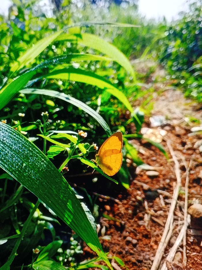 The scene displays a close-up, ground-level perspective of a natural environment. A single butterfly is positioned on a green plant stem near the center-right of the frame. The butterfly's wings are folded upwards, appearing orange-yellow with a subtle darker brown edge visible along the upper wing. The plant supporting the butterfly features multiple small, light-colored flower buds. Several broad, green, grass-like leaves dominate the foreground and midground, with some surfaces exhibiting small water droplets. The ground to the right consists of reddish-brown soil, scattered small stones, and dried plant debris. The background is out of focus, showing dense green foliage. The lighting suggests daylight. No human figures or discernible man-made structures are present. The precise location within the city of Unknown, Unknown, is not identifiable from this image.
