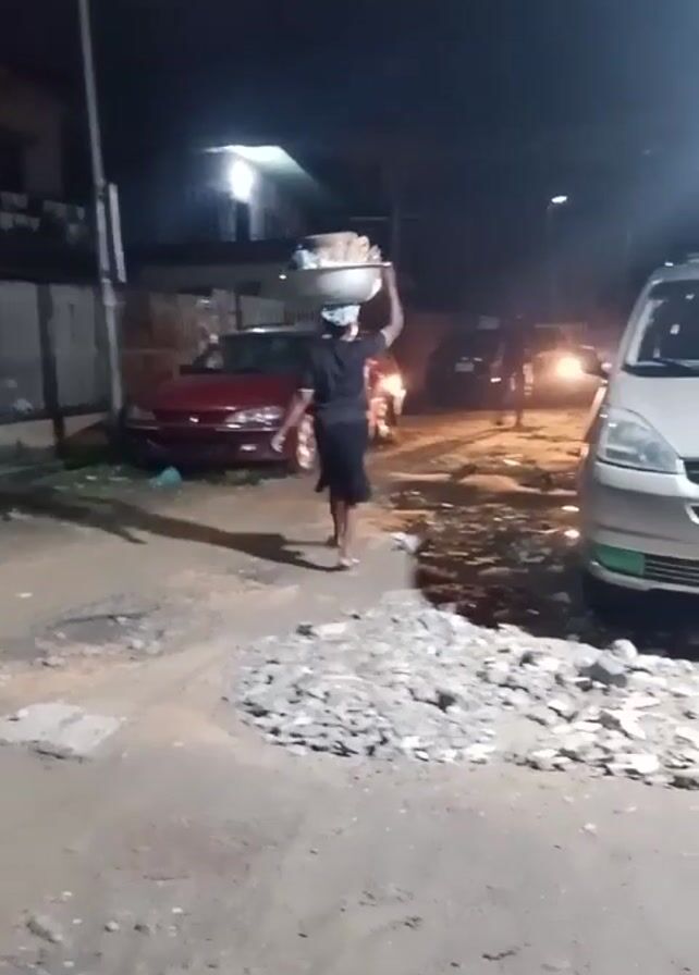 At night, a woman carries a container on her head as she walks along a street in an urban neighborhood