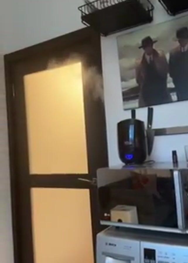 A person filming walks from a kitchen with a humidifier misting from the counter into a bedroom