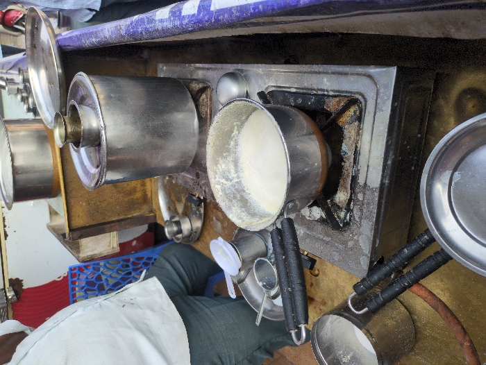 The image depicts an active street-side beverage stall in Tiruvannamalai, India