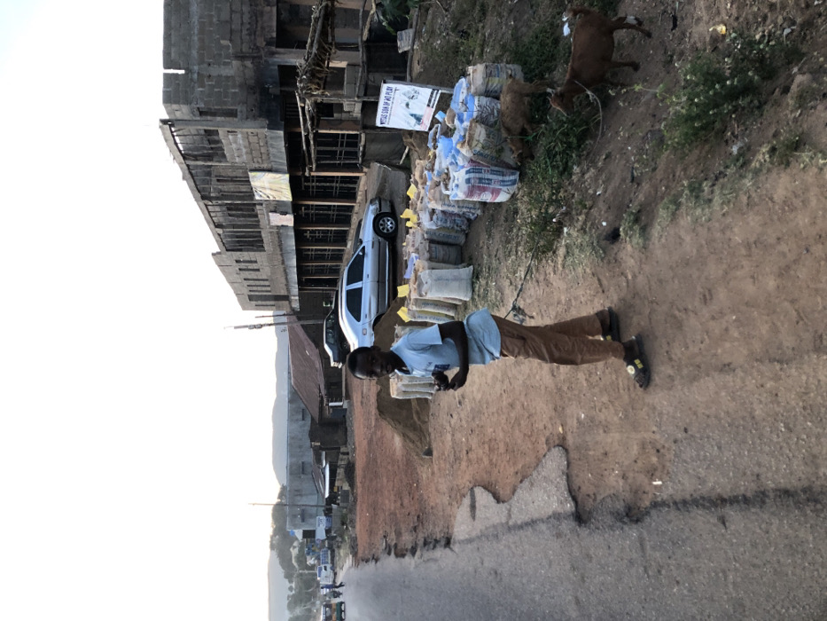 An outdoor scene on Rukuba Road, Nigeria, depicts a partially paved street and an adjacent dirt shoulder under a bright sky, likely late afternoon. In the foreground, a young male, appearing to be a child, stands on the reddish-brown dirt shoulder, facing slightly right of the camera. He wears a light blue t-shirt, brown cargo pants, and dark sandals, holding a small dark object in both hands near his chest. To his right, a display of numerous stacked sacks, predominantly white or light-colored and some wrapped in blue plastic, are arranged on the dirt, likely containing goods for sale. Behind these sacks, a white rectangular sign with black text and an image is visible. Two brown goats are present on the grassy patch near the sacks, one grazing and the other standing, both appearing tethered. In the midground, a silver sedan is parked on the dirt behind the sacks. Further behind it, a large, multi-story building constructed from concrete blocks appears to be unfinished or under construction, featuring exposed walls and open window apertures. To the left, the asphalt road shows significant deterioration along its edge. Vehicles, including a green and yellow auto-rickshaw, and pedestrians are visible on the road in the distance. The background features more structures and distant low-lying hills silhouetted against the bright sky.