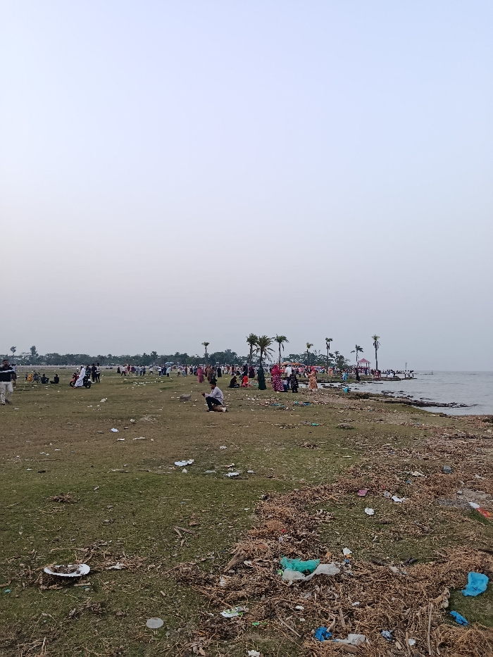 The image displays an expansive outdoor gathering in Charfasson Sadar, Bangladesh, situated along a body of water beneath a clear, pale sky. The ground, from foreground to midground, is an uneven mix of sparse green grass and exposed brown earth, extensively littered with plastic bags (blue, green, white), white Styrofoam plates holding food residue, and dried organic debris. Over 100 individuals are present, standing, sitting, and walking across the area and along the water's edge. Attire includes diverse civilian clothing, with women frequently wearing traditional dresses and head coverings. A man in a light shirt and dark pants squats centrally in the midground. To the right, along the water's bank, several palm trees stand alongside groups of people, and a small, red-roofed gazebo is visible. The calm, greyish water extends into the background. A motorcycle is parked among people in the midground-left.