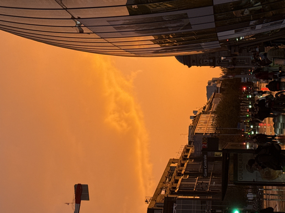 The image depicts an urban street scene in Strasbourg, France, specifically in the vicinity of the Gare Centrale (Strasbourg-Ville train station). The sky is dominated by an intense, uniform orange-amber hue, with faint, elongated cloud formations visible. In the right foreground, a large, modern, multi-story building with a distinct curved, reflective glass facade rises vertically, showcasing reflections of the orange sky and adjacent structures. To the left, a row of diverse multi-story buildings, ranging from traditional architecture to contemporary designs with glass elements, lines the street. A street sign clearly displaying "Gare Centrale" and "2 10" is visible on a pole on the left side of the street. Further left, a green traffic light is active, and a bus shelter featuring an illuminated "GUERLAIN" advertisement is present. A construction crane arm with red and white banding is discernible against the orange sky in the upper left. The street level is wet, indicating recent precipitation, and reflects the vivid orange light from the sky and various city lights. Numerous pedestrians, mostly visible as dark silhouettes, are present on the pavement, walking and standing. Bicycles are intermittently visible among the pedestrians. In the distance, vehicle lights, including red taillights, indicate ongoing traffic. A traditional building with a domed roof is partially visible behind the modern glass building on the right.