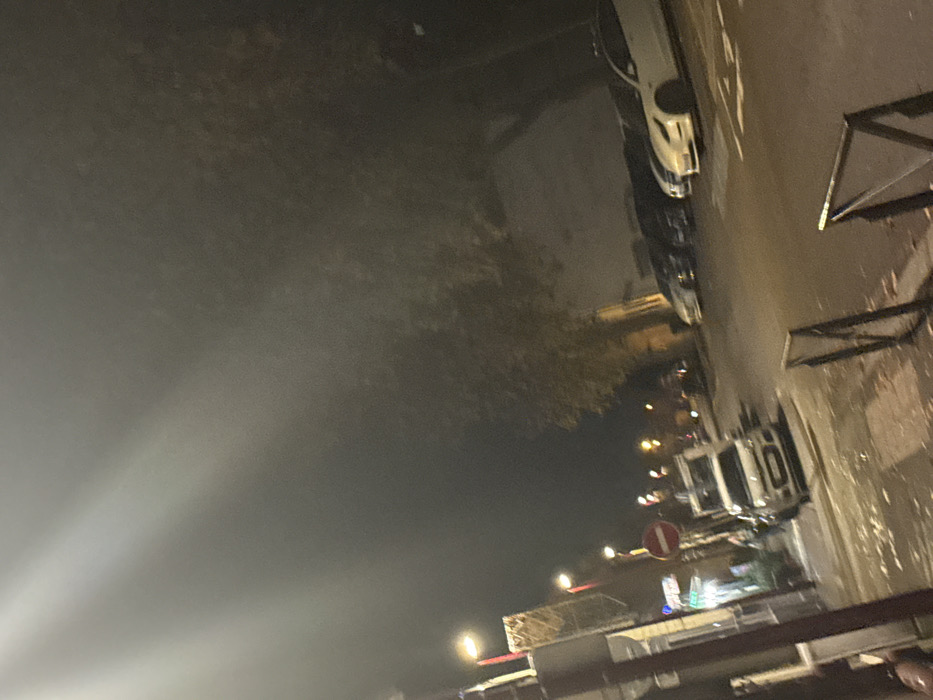 A dimly lit nighttime street scene presents a narrow asphalt road with parked cars along the right edge. A tree with sparse foliage is visible. Streetlights create glowing orbs in the distance, highlighting buildings and a 'do not enter' sign. Wet pavement reflects the ambient light. A metal table or chair structure occupies the lower-right corner, partially obscuring the scene. The overall mood is muted due to the poor lighting conditions and haze.