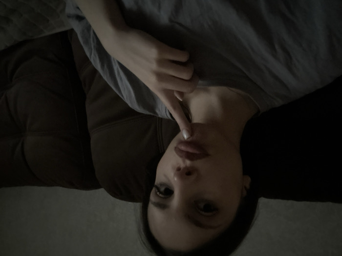 A low-light image depicts a young adult female positioned in a residential interior. She is seated, partially obscuring a brown upholstered sofa or armchair visible behind her right shoulder. The female, with dark hair, wears a grey t-shirt. Her right index finger, adorned with a light-colored nail, is pressed against her chin, below her slightly parted, reddish-brown tinted lips. Eyeliner is visible on her upper eyelids. Her gaze is directed towards the camera. The background to her left is dark and indistinct. The scene is located in Kudrovo, Russia.