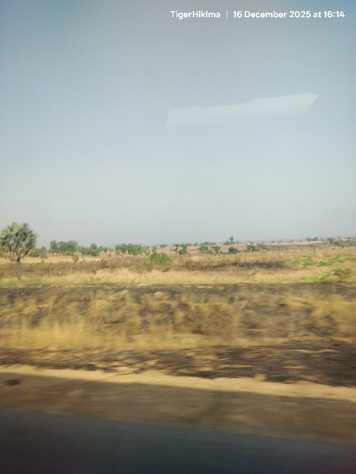 A blurred landscape under a hazy sky. A foreground of dark asphalt transitions to dry, golden grasses interspersed with dark, possibly burnt patches. Beyond, scattered trees and sparse vegetation dot the distant horizon. The image, taken from a moving vehicle, suggests a rural or semi-arid environment. A reflection on the glass is present at the upper part of the image. Text overlays the upper part of the image "TigerHikima | 16 December 2025 at 16:14".