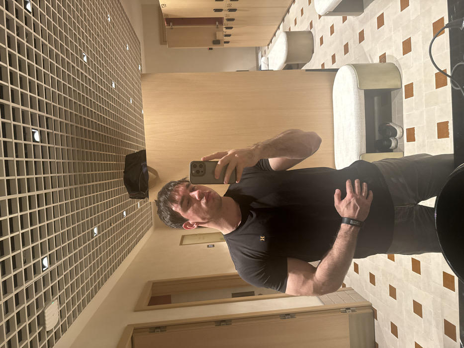 A male individual is observed taking a mirror selfie in a modern locker room or changing facility located in Khimki, Russia