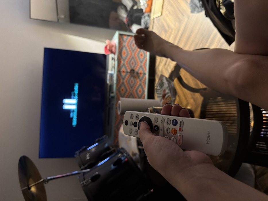 The image depicts an indoor residential setting, presumably a living room, located in Ust-Ilimsk, Russia. The scene is presented from a low, first-person perspective, looking towards a large, wall-mounted or credenza-placed flat-screen television. The television displays a dark blue screen with a central white "pause" symbol (two vertical parallel lines) and a horizontal line of white text or a progress bar beneath it. In the immediate foreground, a left hand with dark-painted fingernails holds a white Haier-branded television remote control. The thumb is positioned on the central directional pad, indicating active use. To the right of the hand, a bare right leg is extended forward, with the foot visible and relaxed. These body parts suggest a seated individual. A dark-colored, circular coffee table with a slatted base is positioned between the viewer and the television. On the table, a white cylindrical object (possibly a roll of paper), a dark beverage can or bottle, and a clear glass bowl containing snack items are visible. To the far left of the frame, a portion of a black drum set is visible, including a cymbal on a stand and two drum shells reflecting ambient light. The television rests on a credenza or TV stand featuring a distinct orange and grey geometric pattern. The room's floor is covered with wood laminate or planks. In the background to the right, a floor lamp with a rectangular shade is partially visible, along with indistinct piles of clothing or fabric on the floor. The overall lighting is dim, suggesting evening hours or subdued artificial illumination.