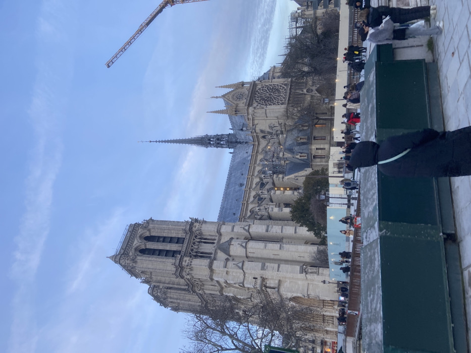 Notre Dame Cathedral stands majestically, partially obscured by a construction crane
