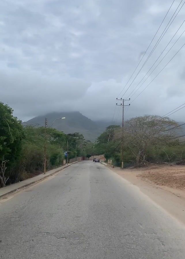 straight, paved road leading towards a mountain in the distance. The mountain's peak is obscured by low-hanging, grey clouds. The road is flanked on both sides by trees and foliage, though the vegetation appears sparse. Utility poles and wires run along the right side of the road. The overall lighting suggests a cloudy or overcast day. A car is visible in the distance, driving away from the camera. There is a yellow guardrail on the right side of the road in the foreground. The road surface is somewhat worn with some patches.