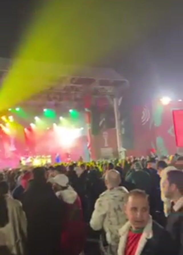A crowd of people is gathered at a nighttime event in front of a stage. The stage has bright lights in yellow, green, and red, illuminating performers. A large screen displays imagery. Many individuals in the crowd are wearing jackets and hoodies, and some are facing the stage while others are looking around. The overall environment is lively and energetic.