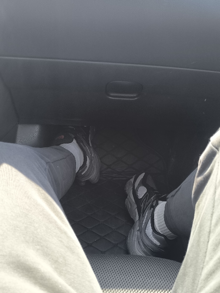Inside a vehicle in Voluntari, Romania, a low-angle, first-person perspective captures the legs and feet of an occupant. The individual wears light-colored trousers on the left leg and dark-colored trousers on the right leg, both featuring light grey athletic socks and bulky dark grey/black athletic shoes. The feet rest upon a black, diamond-quilted floor mat. The lower section of a dark-colored dashboard or glove compartment, equipped with a handle, is visible forward of the feet. A textured, dark grey seat edge is present in the immediate foreground. Natural light illuminates the left side of the scene.