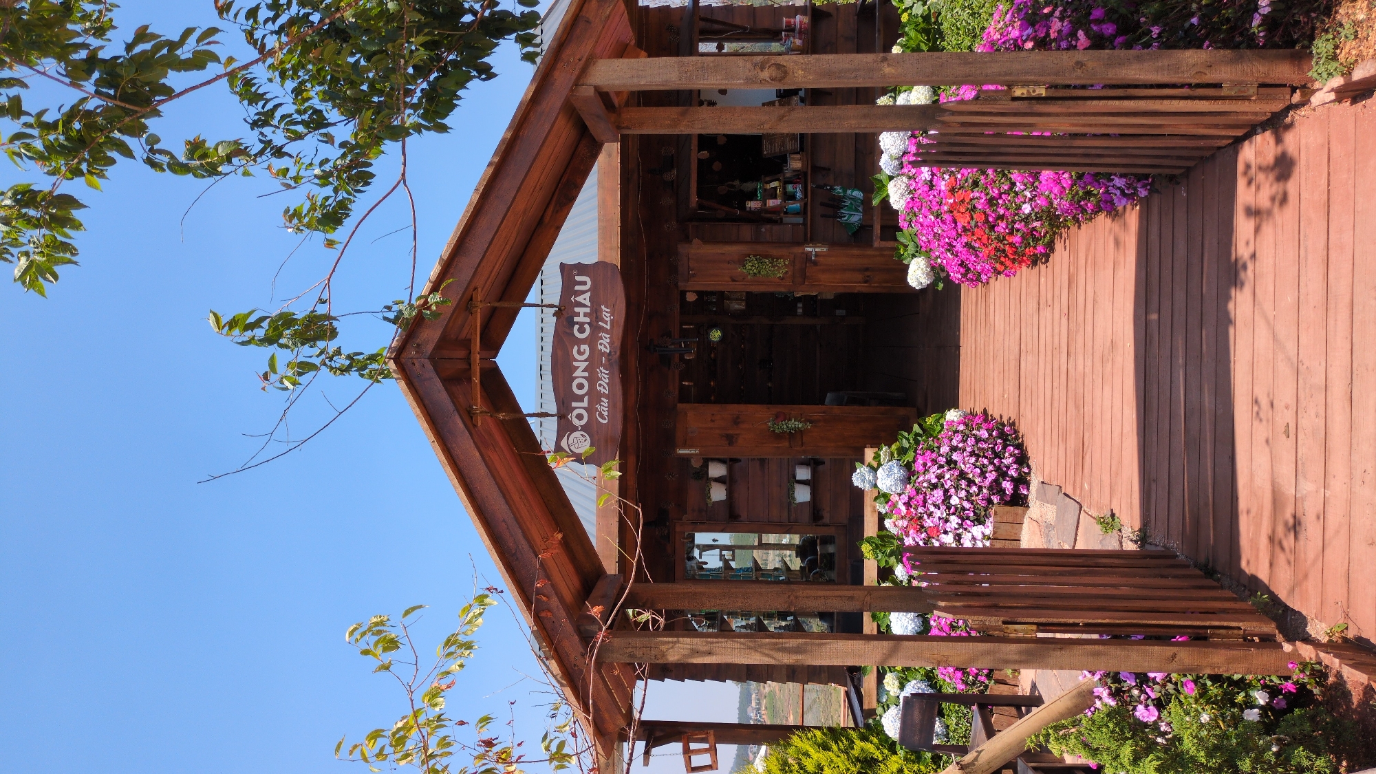 The image captures the Olong Châu Cau Dat tea shop in Trường Thọ, Vietnam. The shop has a rustic wooden structure with a sign hanging above the entrance. A wooden walkway leads to the entrance, bordered by colorful flower beds. Trees with green leaves are visible on the side, and a clear blue sky forms the backdrop.