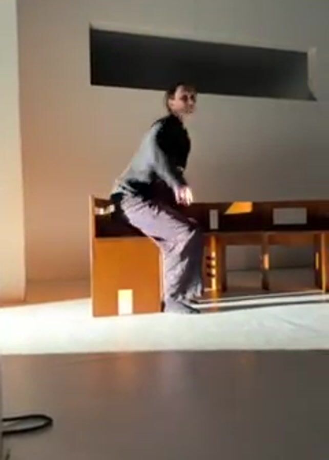 person sitting on a wooden chair in a bright white room. The person is wearing a black and gray jacket and loose purple pants. They have long brown hair pulled back in a ponytail. The chair is positioned next to a long wooden desk or shelf-like structure with sections of various sizes. A rectangular window is visible in the white wall behind the desk. Sunlight streams through the window and casts shadows on the desk, floor, and chair. The person rises from the chair, makes a few arm gestures, and then sits back down. A black cable is visible on the floor in the foreground.