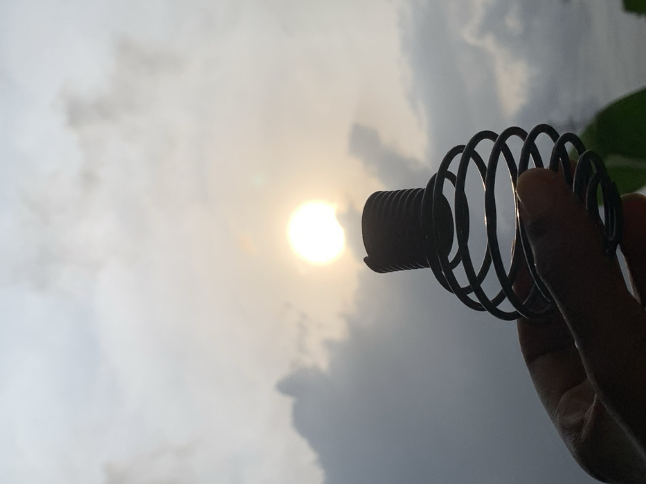 - "Against a cloudy sky, a hand holds a dark, cylindrical, and spiraled object, possibly metal or plastic, with the sun partially eclipsed behind it" by FM-8xdlM2, licensed under CC BY 4.0