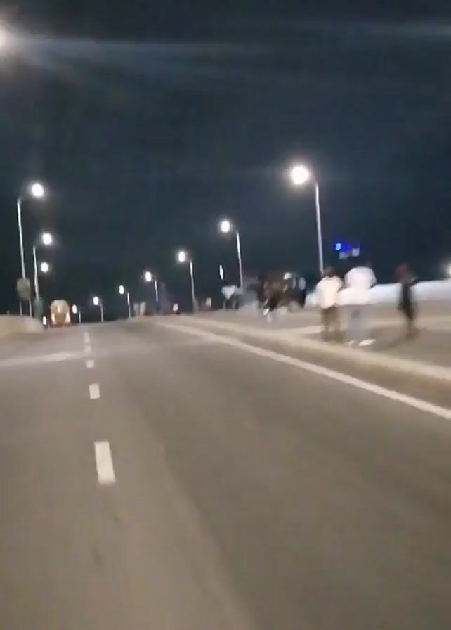 nighttime view of a road lined with streetlights. Several people are walking or standing on the side of the road. Some vehicles are seen in the distance. The road has white lane markings. The sky is dark.