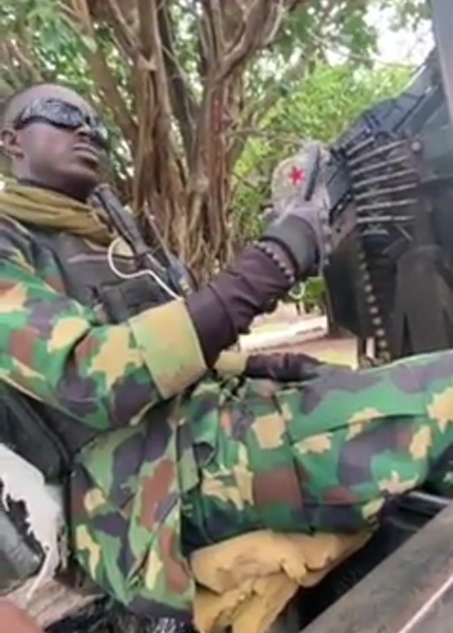 A medium shot captures a soldier clad in camouflage uniform and dark sunglasses