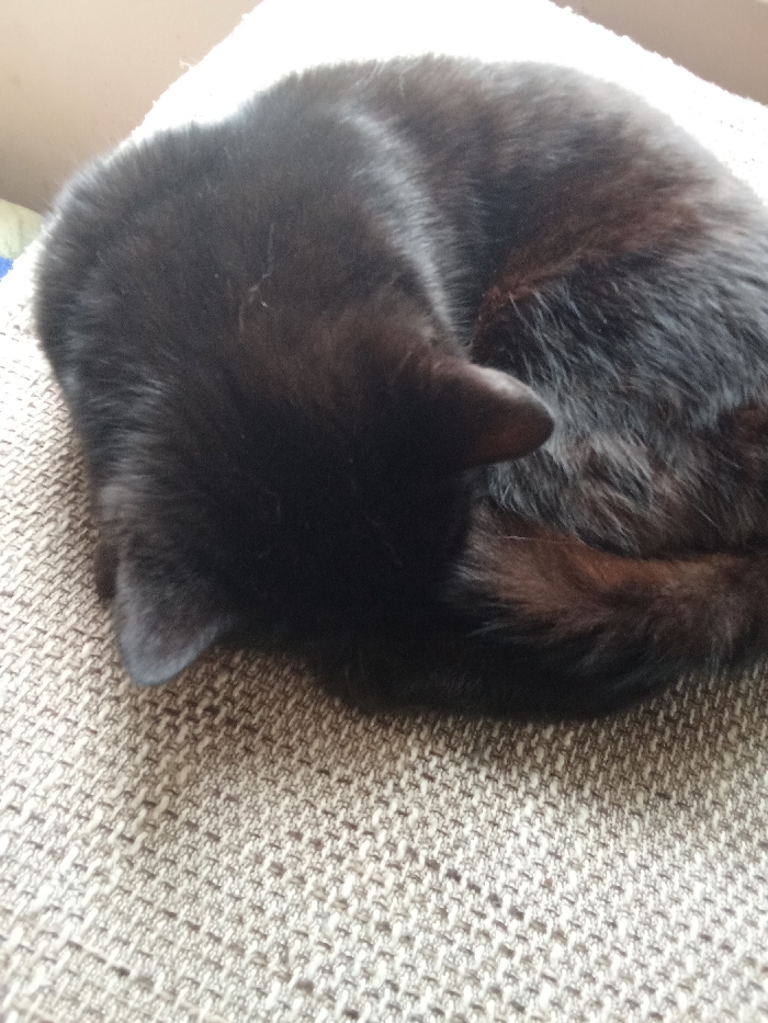 - "A black domestic cat is observed curled tightly in a resting or sleeping position on a textured, light brown or beige fabric surface" by FM-ULG7s2, licensed under CC BY 4.0
