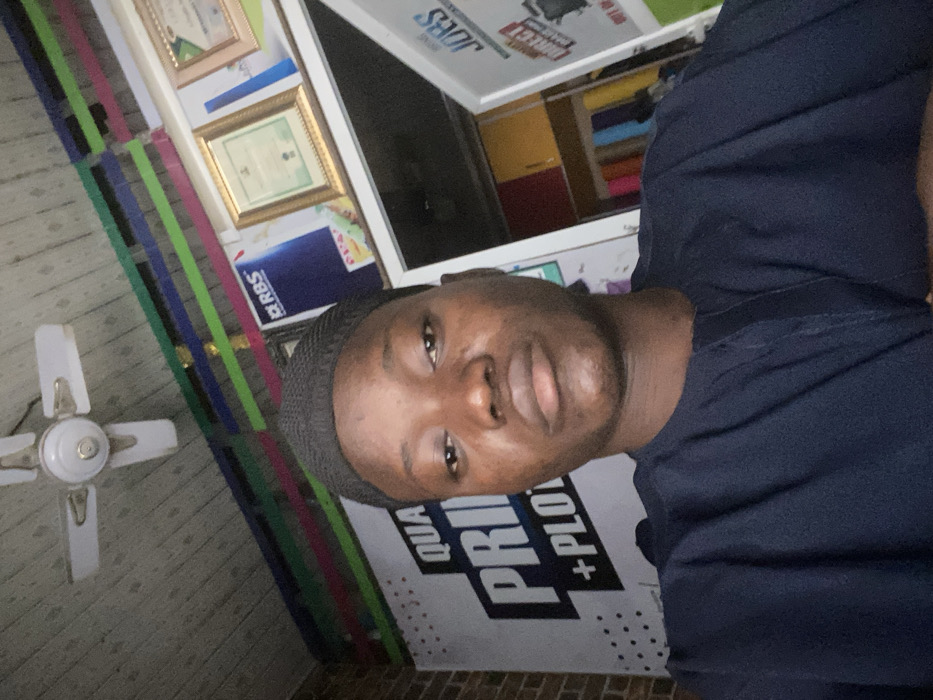 A dark-skinned individual, appearing to be male, is captured in a close-up, front-facing indoor photograph within a commercial establishment in Sabon Gari East, Nigeria