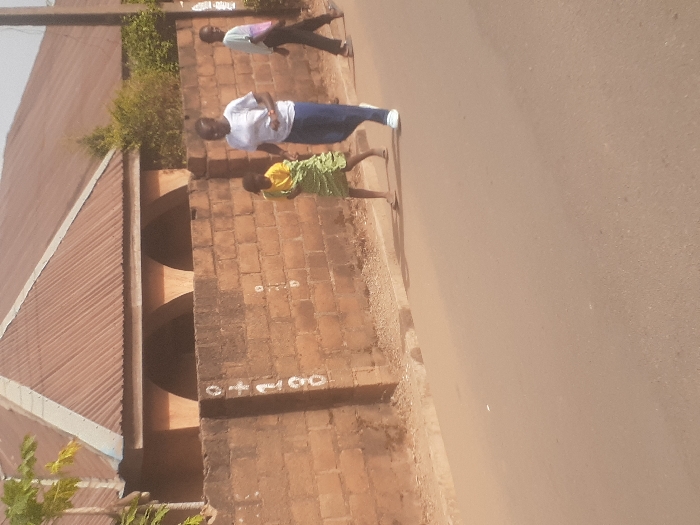 Three people walk along a roadside next to a brick building. A woman in a white shirt and blue jeans walks behind a child in a yellow shirt and green skirt. A man in a blue shirt and black pants walks in front of the woman. The building has two large arched openings and a metal roof. White markings are painted on the brick wall that reads "+100". The road is a dusty, brown color.
