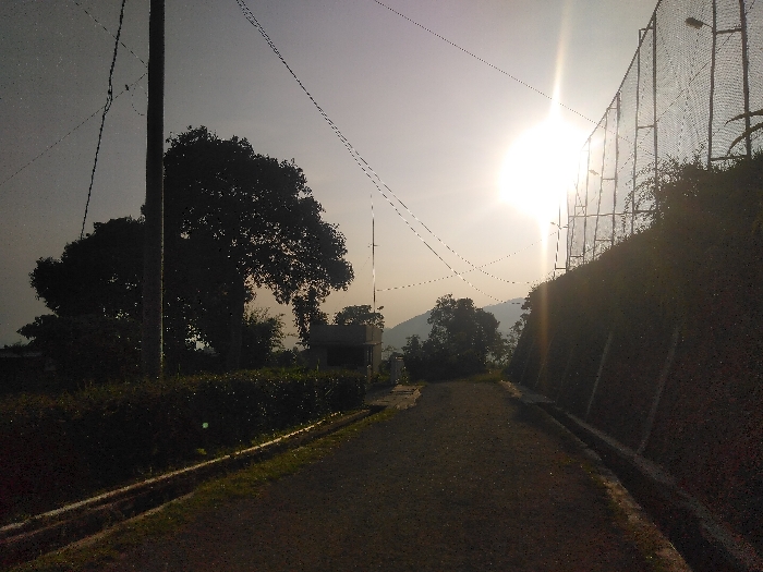 The image depicts a rural or semi-rural road scene in the city of Morgedal, Norway. A paved road, appearing to ascend gently, occupies the foreground and recedes into the distance. It is bordered on both sides by narrow, unlined drainage ditches. On the left side, a prominent utility pole stands tall, supporting several overhead power lines that stretch across the frame. Behind the pole and extending along the left side is dense, dark foliage, punctuated by large, silhouetted trees. Further down the road on the left, a small, light-colored building with a dark roofline is partially visible amidst the greenery. On the right side of the road, a steep, dark embankment rises, covered in dark, possibly textured material, and topped by a tall, gray wire mesh fence supported by vertical posts. Several white light fixtures are mounted along the fence line. The bright, intense sun is positioned high on the right side of the frame, casting significant lens flare and strongly backlighting the scene, causing most foreground elements to appear in silhouette against a pale, bright sky. Distant hills or mountains are faintly visible on the horizon, obscured by the atmospheric haze and strong backlighting. No people or animals are visible in the scene.