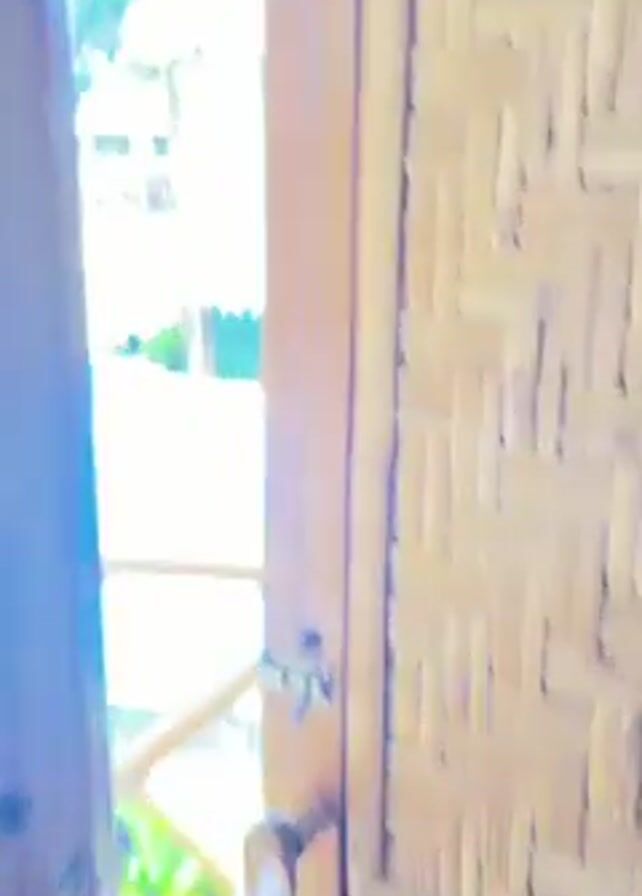 A person opens a bamboo door to reveal a view of a tropical resort with a swimming pool. The pool is surrounded by small bungalows with thatched roofs. A person is swimming in the pool. The sky is blue with scattered clouds. Palm trees are visible in the background.