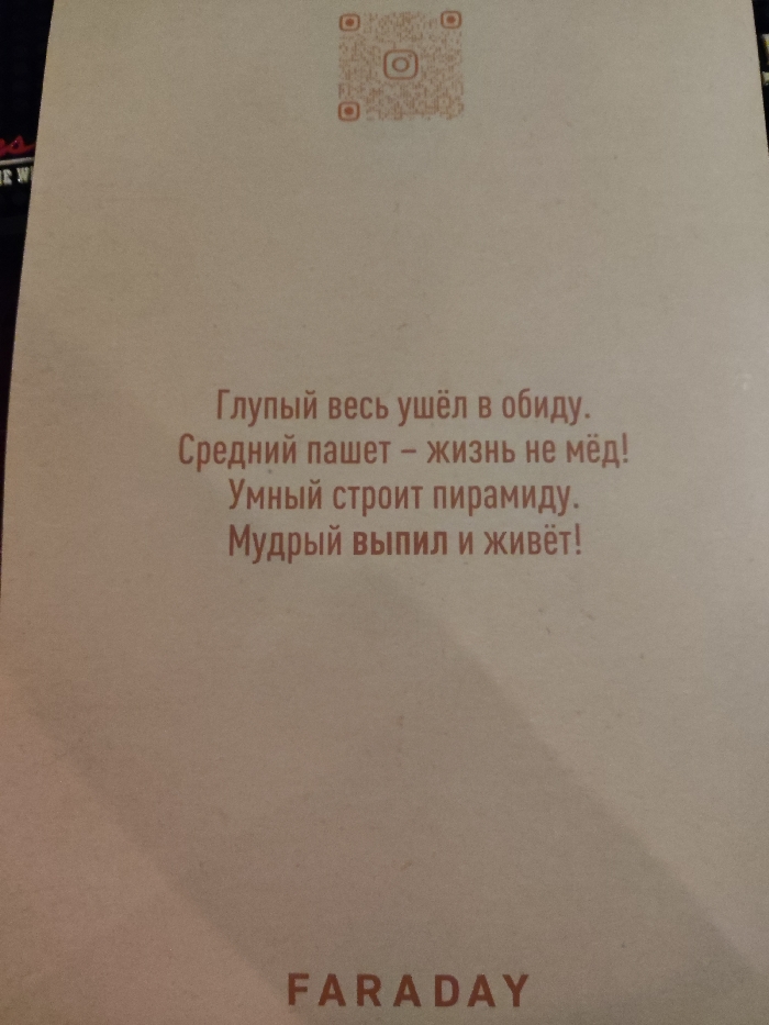 A rectangular light beige card is depicted in an indoor setting at Unknown, Unknown. A QR code, centrally located in the upper portion, contains the Instagram logo. Below the QR code, four lines of text are printed in reddish-brown Cyrillic font: 'Глупый весь ушёл в обиду. Средний пашет – жизнь не мёд! Умный строит пирамиду. Мудрый выпил и живёт!' (The fool completely succumbed to resentment. The average one toils – life isn't honey! The clever one builds a pyramid. The wise one drank and lives!). At the bottom, centered, the word 'FARADAY' is printed in the same reddish-brown uppercase sans-serif font. The left edge of the card borders a dark, out-of-focus object, likely another part of a menu or a table surface. No individuals or active subjects are visible.