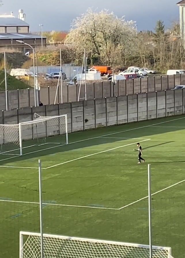 The scene depicts a soccer field with artificial green turf and white lines, viewed from an elevated perspective. A lone person in dark clothing is walking on the field away from the camera, towards the far goal. The field is enclosed by a concrete wall with a few individuals visible behind it. Beyond the wall are parked vehicles and industrial buildings, set against a backdrop of trees and a cloudy sky.