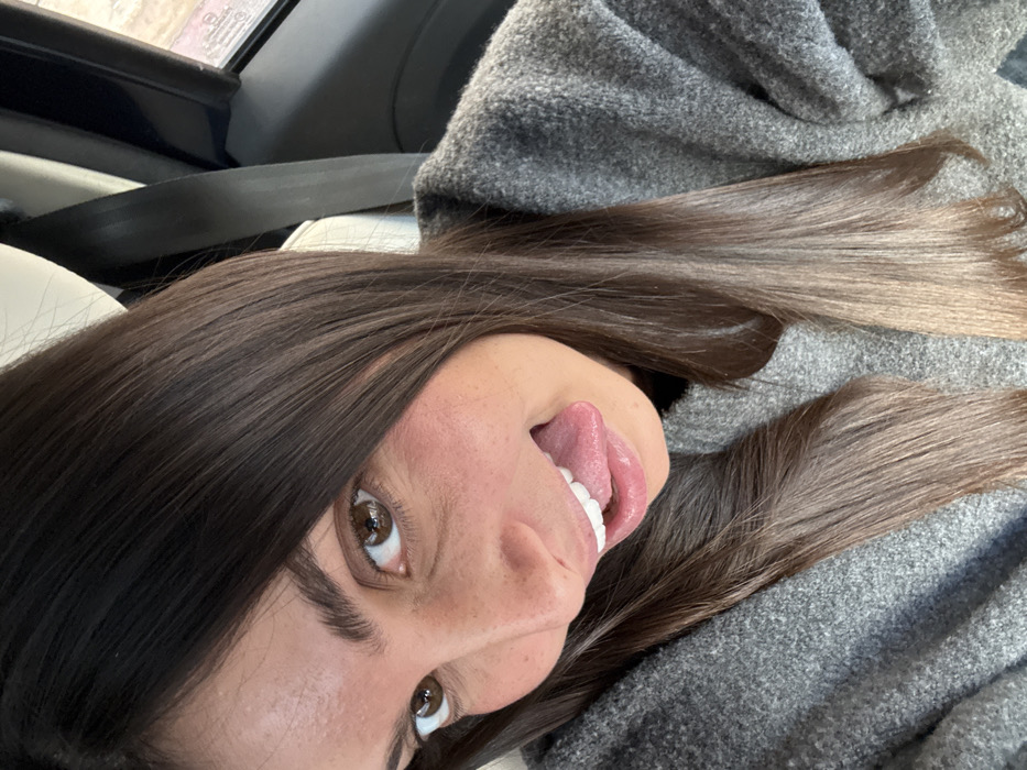 A woman tilts her head, sticking her tongue out with a playful expression. Her brown hair falls across her forehead and shoulder. She has brown eyes and freckles. She appears to be in a car, judging from the seatbelt and window. She wears a gray, textured sweater.