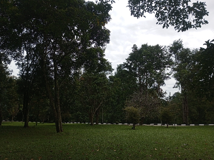 A tranquil park setting features a grassy lawn bordered by a black and white striped edge. Towering trees with lush green foliage frame the scene, with some branches visible against the overcast sky. The overall atmosphere is peaceful and serene, suggestive of a natural outdoor space.