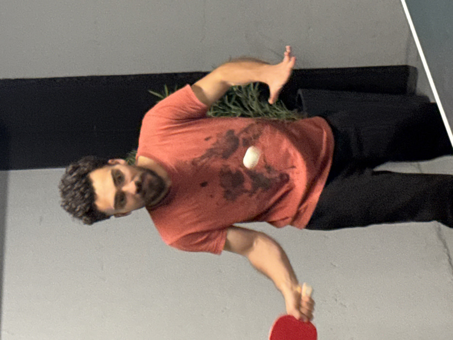 A man with curly hair and a beard holds a red ping pong paddle and looks at the camera. An egg is stuck to the front of his orange shirt. He is wearing black pants and appears to be playing ping pong outside. A black planter with greenery sits behind him. Part of a ping pong table is visible in the upper right corner. The background is a grey wall.