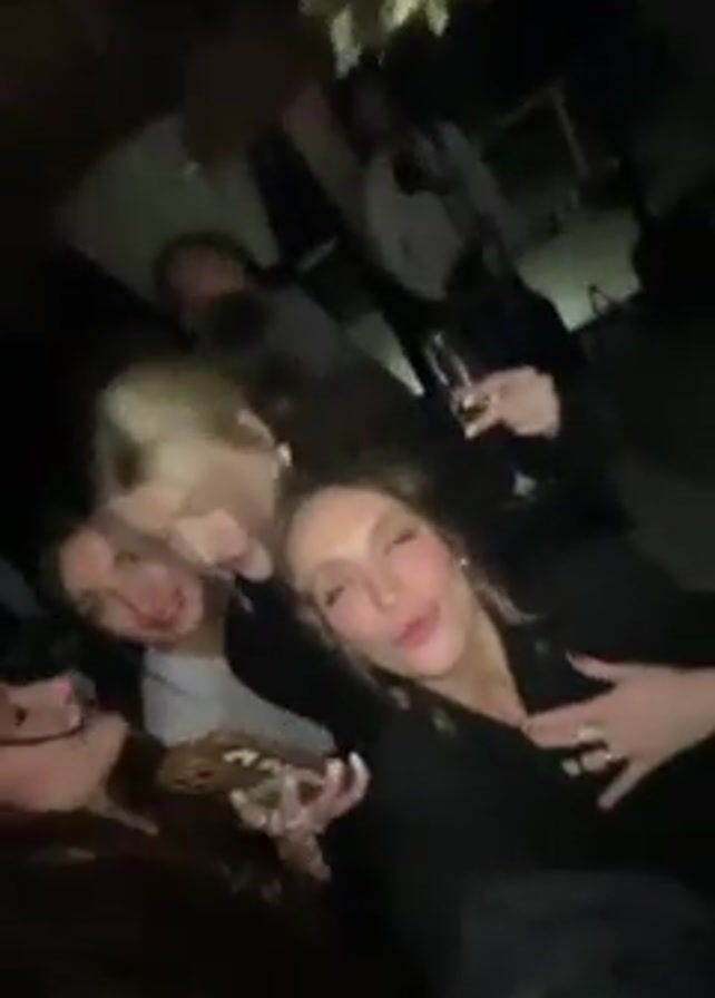 five women laughing and smiling while taking a selfie. They are dressed up and appear to be at a party or event. Some of them are holding drinks, and the background is dark with other people milling around.