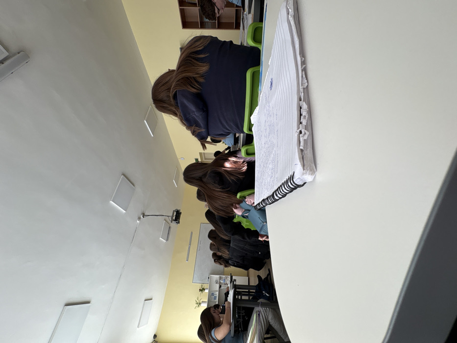 The image depicts a classroom in Botevgrad, Bulgaria, viewed from a low angle at a student's desk. In the immediate foreground, an open, spiral-bound notebook with handwritten text and worn pages rests on a white desktop. The midground shows multiple students, predominantly with long, dark hair, seated at individual desks, facing away from the camera. The student directly in front wears a dark blue hoodie and occupies a bright green chair. To their left, another student wears a black jacket, also in a green chair, with a light blue bag on the floor. A student on the far left, partially visible, is actively writing at a desk. On the far right, a male student with shorter hair is seen looking down. The background features light yellow walls and a white ceiling equipped with multiple rectangular light panels and a suspended projector. A whiteboard with faint markings is visible on the left wall, beneath which a shelf unit holds small potted plants. On the right, a multi-compartment wooden bookshelf is visible.