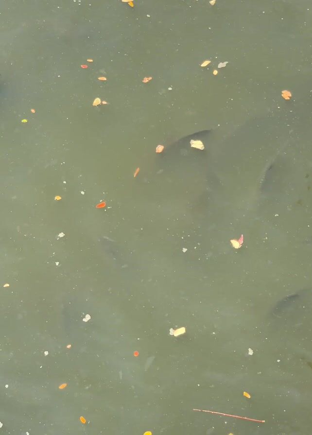 murky body of water scattered with small, colorful leaves. Several fish are visible swimming beneath the surface, their forms indistinct due to the water's opacity. A coconut floats near the surface on the left side of the frame. The camera remains static throughout the video, providing a top-down view of the scene.