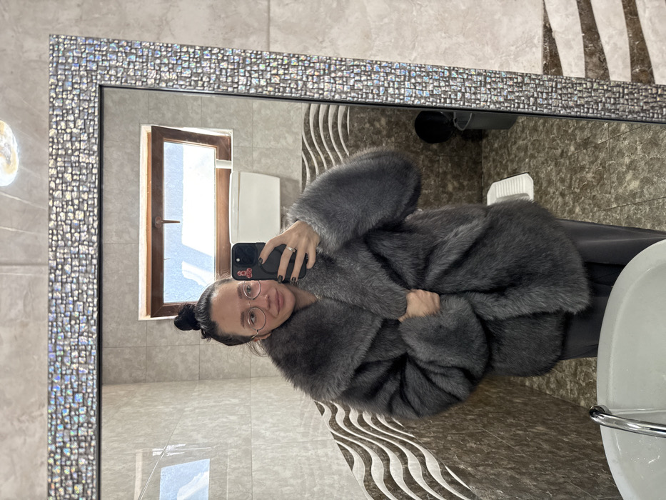 A female subject is depicted in a full-length mirror selfie within a bathroom setting, likely located in Dilijan, Armenia. The subject, a woman with dark hair styled in a top bun, is wearing round, clear-rimmed glasses. She is dressed in a voluminous, dark grey faux fur coat with a wide collar and dark-colored trousers. Her left hand holds a black smartphone, featuring a pronounced camera array and a light-colored accessory on its case, positioning it to capture the reflection. A silver-toned ring is visible on her left ring finger. Her right hand grips the front of the fur coat near her chest. The mirror features an elaborate frame composed of small, iridescent, mosaic-like tiles. The bathroom walls are tiled with light beige/grey square tiles, with a section of decorative wavy, textured tiles in shades of brown and beige visible on the left and right. A white ceramic sink with a chrome faucet is in the lower left foreground. In the background reflection, a white ceramic toilet with its cistern is visible. Above the toilet, a wooden-framed window is partially open, revealing a bright outdoor scene. A small, decorative ceiling light fixture is reflected in the mirror's upper center. A dark-colored trash bin is partially visible on the tiled floor to the right of the toilet.