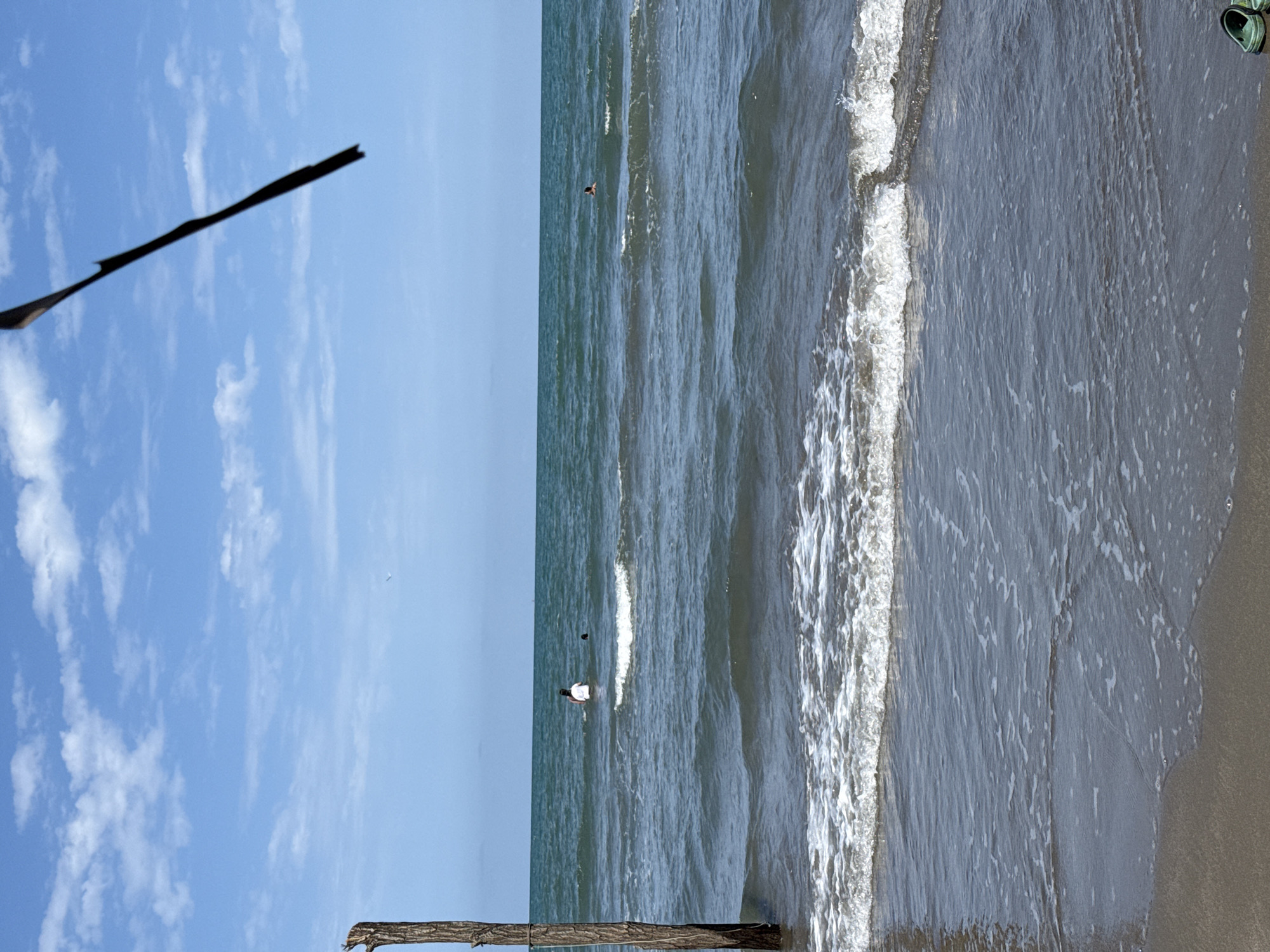 The image depicts a coastal scene in Mata de Uva, Mexico. The scene includes the ocean, beach, and sky. A person is seen in the water, and there are clouds in the sky. The presence of a wooden structure is visible. The waves are coming in to shore.