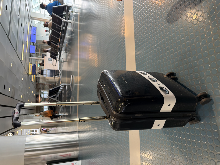 The image displays an airport gate waiting area at Stockholm-Arlanda Airport, Sweden. In the foreground, a black, hard-shell carry-on suitcase with an extended silver telescopic handle stands upright on a blue-grey rubberized floor with a circular stud pattern. The suitcase features a white horizontal band across its lower half, adorned with blue "eye" logos and black stars, and shows signs of minor surface wear. A white demarcation line traverses the floor in the mid-ground. In the background, a gate desk is visible on the left, displaying "GATE 39" and a yellow digital screen with "RYANAIR" visible. Multiple rows of black, metal airport seating are arranged in the waiting area. Approximately five to seven individuals are present, with several seated in the chairs, including one person in an orange top and another in a blue top. Further right, multiple blue digital screens are mounted. The area is well-lit by overhead recessed lighting and natural light entering from large windows on the right, which cast reflections on the polished floor. A large, silver-colored cylindrical pillar is partially visible on the far left.