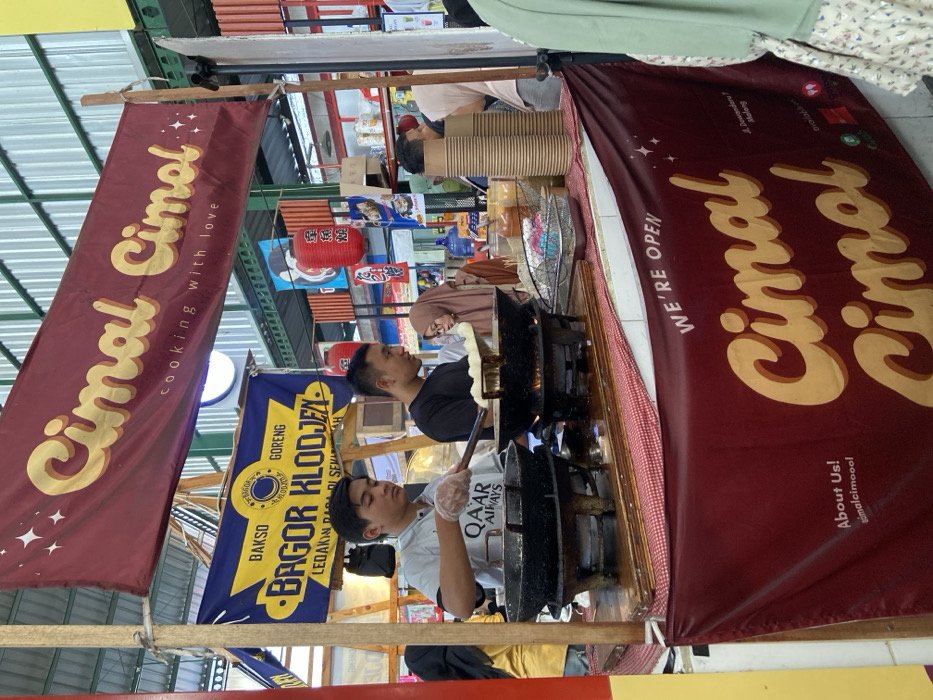 A food stall showcases two red banners advertising "Cimal Cimol," emphasizing "cooking with love" and "we're open