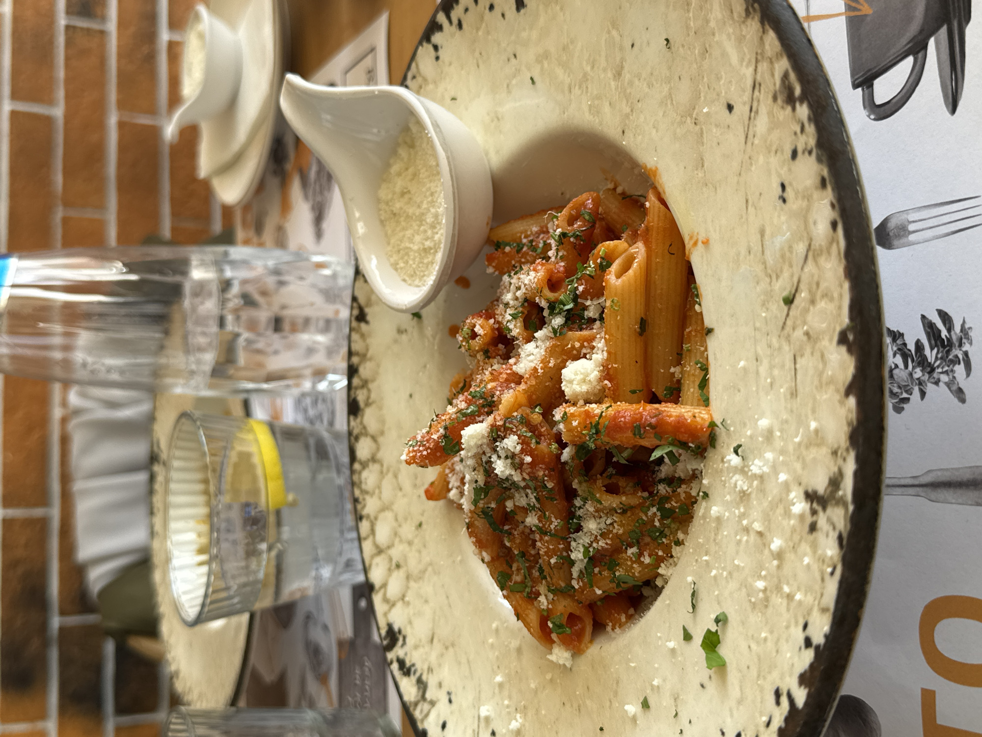 A plate of penne pasta with tomato sauce, grated cheese, and chopped green herbs, likely parsley, is presented on a cream-colored, rustic-edged plate. A small white ceramic dish containing additional grated cheese sits to the right of the pasta plate. In the background, a glass of water with a lemon slice is visible, along with a tall, clear glass bottle of water. The items are placed on a wooden table, partially covered by a paper placemat featuring graphic elements including a fork, a coffee cup, and text fragments. The background consists of an out-of-focus brick wall in shades of orange-brown, indicating an indoor restaurant setting. Distant white chair backs and other blurry objects suggest additional dining furniture. A specific location within the city of Sofia, Bulgaria, is not discernible from the provided image.