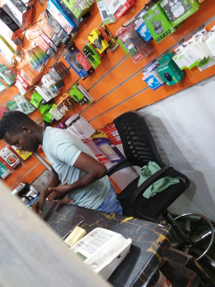 A man is seen in a shop setting, wearing a light blue t-shirt and jeans. He is standing behind a dark-colored counter with a white telephone on it. An office chair sits behind him with a green cloth draped over the seat. The background features an orange wall covered with various packaged electronics, suggesting a store specializing in electronic accessories. The setting is a bit cramped and the image is slightly tilted.