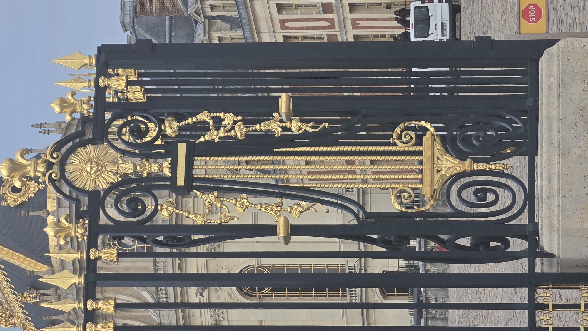 The image provides a detailed, slightly angled view of a section of the ornate black and gold wrought iron Royal Gate at the Palace of Versailles, France. The gate, positioned in the foreground, features extensive gilded decoration including fleur-de-lis motifs, pointed finials, elaborate scrollwork, tasseled elements, and a prominent central sunburst emblem with a human-like face. It rests on a light-colored stone plinth. Beyond the gate, the architecture of the Palace of Versailles is visible. To the left, a grand, light-colored stone building with tall, arched windows is present, topped by a partially visible dark, ornate dome structure. To the right, a building with a reddish-brown facade and multiple rectangular windows is discernible. The ground beyond the gate is paved with cobblestones. In the mid-ground and background, several indistinct human figures are present, appearing as small, dark silhouettes. A white van, bearing the French license plate "EL-295-KB," is parked on the cobblestone pavement in the right mid-ground. A yellow sign with a red "STOP" octagon is partially visible behind the lower right section of the gate. The sky is overcast.