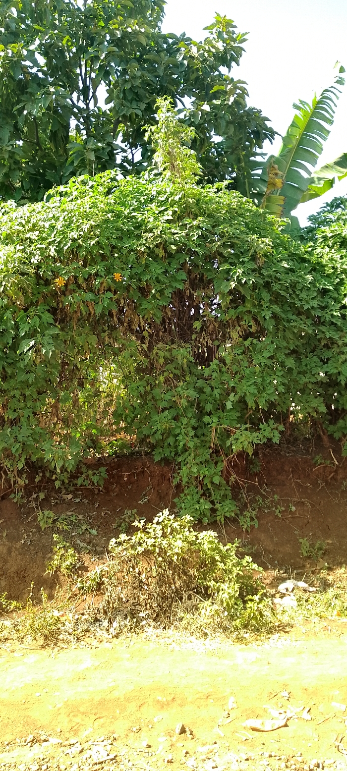 Lush greenery dominates the scene. A thick, leafy bush with scattered yellow flowers spills over a small dirt bank. Above, taller trees and a banana plant extend skyward. The ground is a mix of dirt and light-colored patches, possibly gravel or sandy soil. The scene is bathed in sunlight, creating bright highlights and shadows.