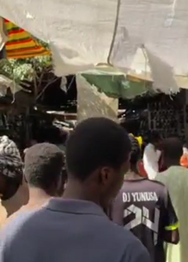 crowd of people walking through an outdoor market. The market stalls are covered with white tarps, providing shade from the sun. People are walking in various directions, browsing the merchandise on display. The clothing of the individuals in the video ranges in color and style, including a green shirt, a brown shirt, and a blue shirt. Some are wearing traditional African clothing. The environment is bustling and active, suggesting a busy marketplace.