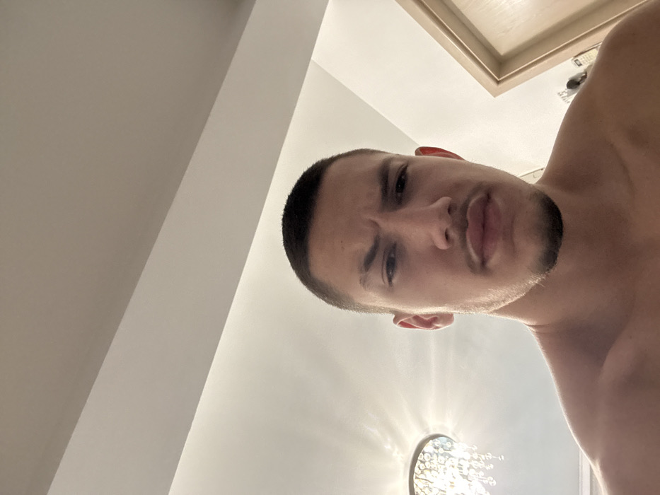 A male individual is depicted in a frontal, close-up view, appearing shirtless and looking directly at the camera with a slightly furrowed brow