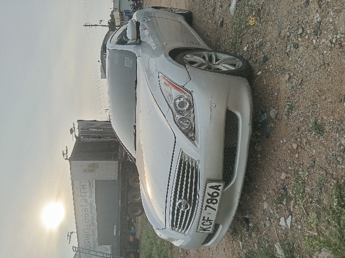 A silver Nissan sports coupe, displaying Kenyan registration plate KCF 786A, is parked on an unpaved, gravel and dirt surface in Kisumu, Kenya