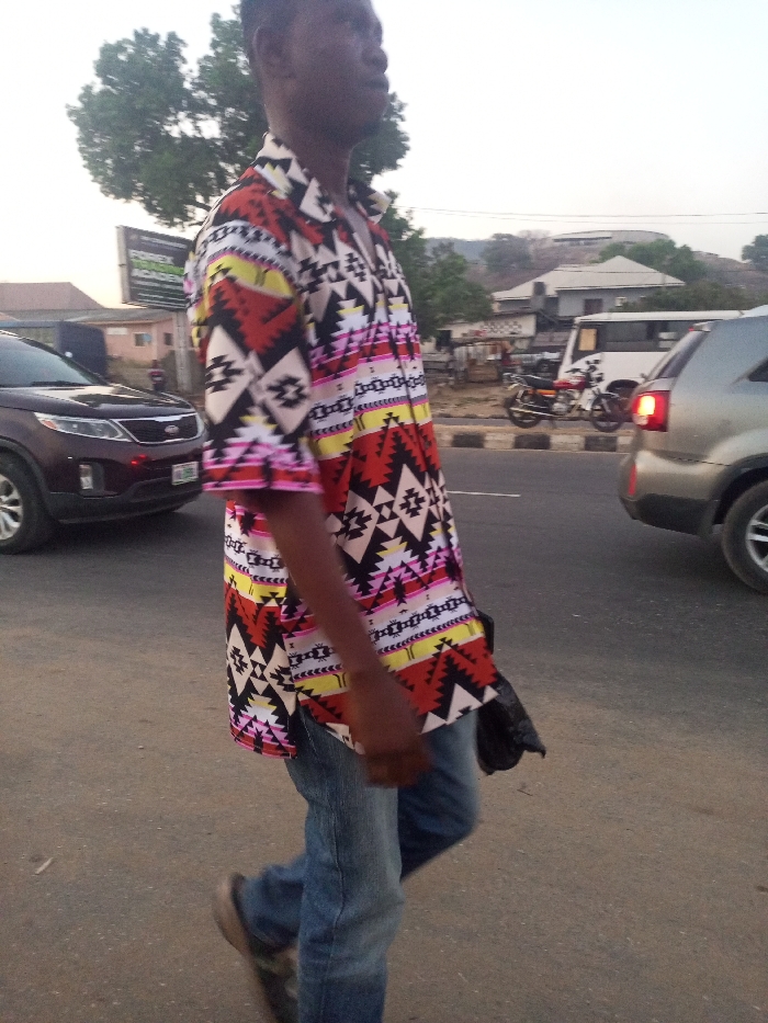 - "A man crosses a street wearing a colorful patterned shirt and blue jeans" by FM-4tF3m1, licensed under CC BY 4.0
