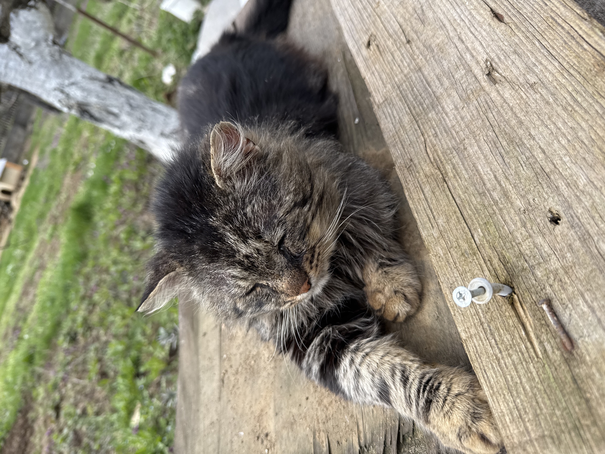 A long-haired tabby cat with black fur is lying on a weathered wooden surface. The cat has its eyes closed, suggesting it is resting. The wooden surface appears to be part of an outdoor structure, potentially a fence or a deck. A nail and a screw are visible on the wooden surface near the cat's paw. The background is blurred, showing grass and possibly some trees or other vegetation. The photograph appears to have been taken outdoors in Berkovitsa, Bulgaria.