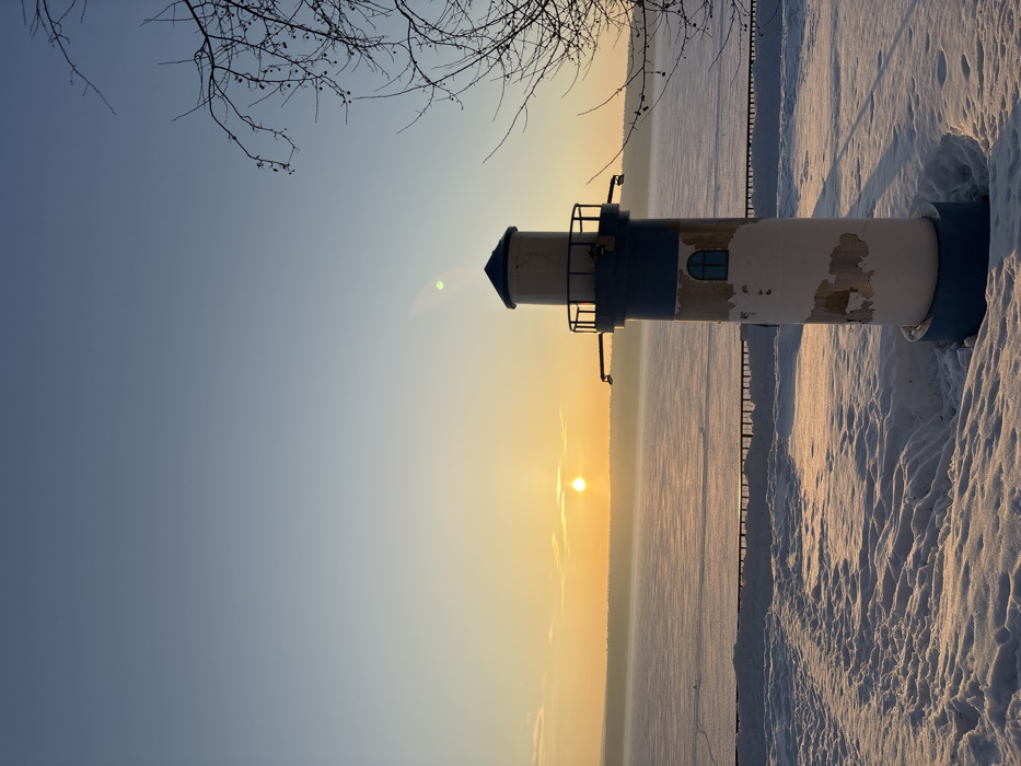 The image captures a static winter landscape in Chaikovsky, Russia, during either sunrise or sunset. The foreground consists of undulating snow-covered ground, exhibiting subtle textures and faint tracks. Slightly right of the frame's center stands a decorative lighthouse model. This structure features a blue base, a weathered white main body with peeling paint, a central blue band, a small rectangular blue window in its lower white section, and a dark railing near the top from which two small lamp-like fixtures protrude. A dark, low fence runs horizontally across the midground behind the lighthouse, separating the snow-covered embankment from the frozen body of water beyond. The background is dominated by a vast, flat expanse of frozen water, presumed to be the Kama Reservoir, extending to a distant horizon line where a faint landmass or treeline is discernible. A bright, circular orange sun is positioned low on this distant horizon, casting long shadows and imbuing the sky with warm golden and orange tones that transition to a clear, pale blue overhead. Bare, dormant tree branches are visible along the upper right edge of the frame. No individuals are present in the scene.
