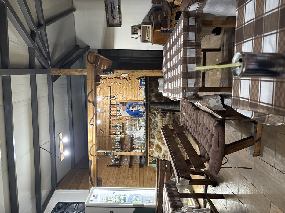 The image displays the interior of a rustic establishment in Radomir, Bulgaria, illuminated by artificial light