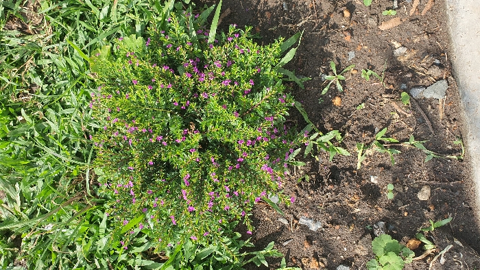 The image depicts a small, dense, flowering bush situated in a patch of soil adjacent to a grassy area within Kobura ward, Kenya. The central subject is a rounded evergreen bush, approximately 0.5 meters in diameter, characterized by numerous small, vibrant green leaves and abundant tiny purple-pink flowers evenly distributed across its foliage. The bush is planted in dark brown, disturbed soil, which contains sparse green weeds and small fragments of rock and organic debris. Surrounding the bush, particularly in the upper portion of the frame, is an expanse of unkempt green grass, featuring longer blades. A light grey concrete edge, possibly a curb or pathway, is visible along the bottom right perimeter of the frame. The scene is illuminated by direct sunlight, creating distinct shadows and highlighting the textures of the vegetation and soil. No individuals, animals, or explicit actions are present within the frame.